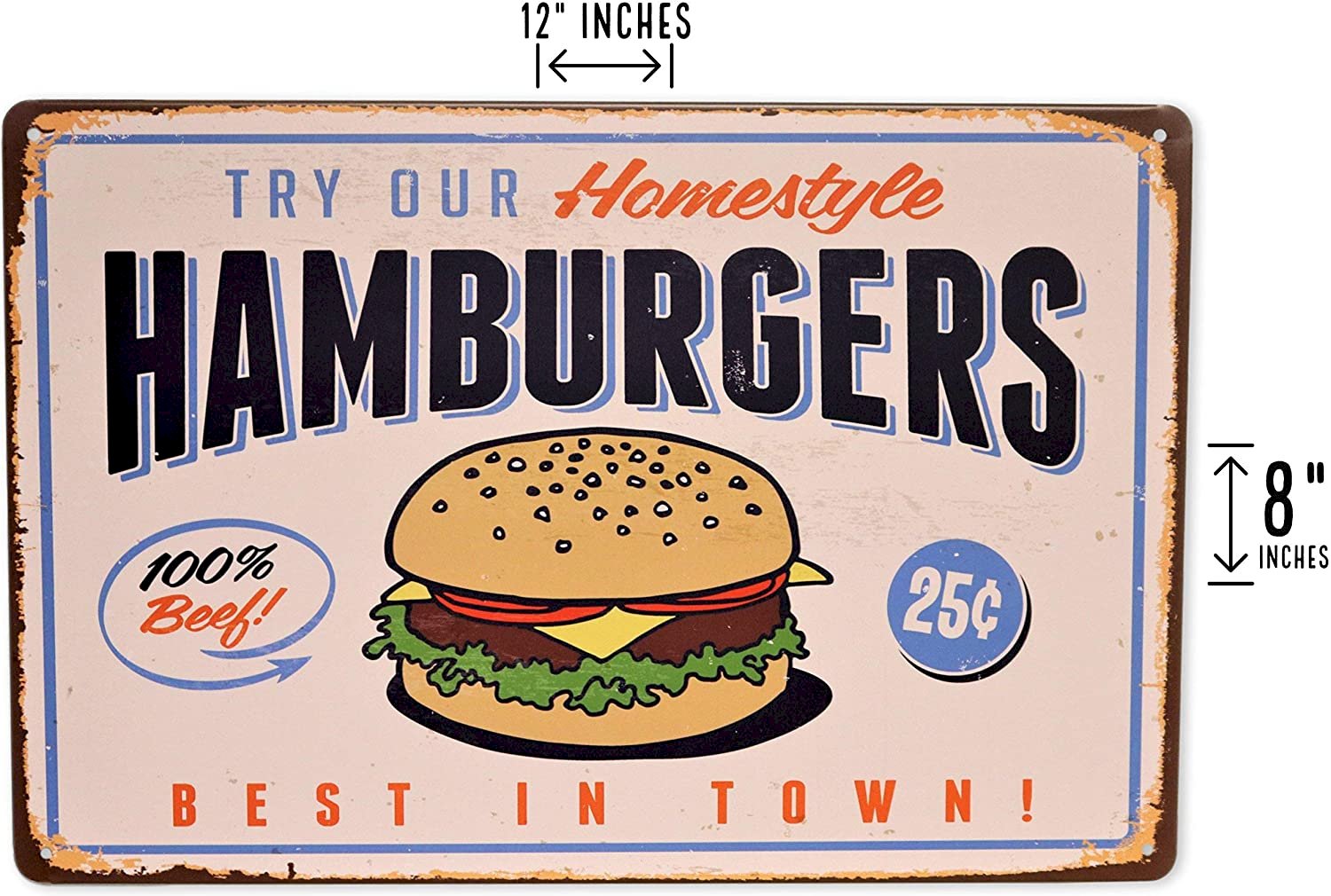 Homestyle Hamburgers 100% Beef Burgers Best in Town Vintage retro food diner decor metal tin sign. This Retro sign would add a great touch to any Home, Kitchen, Man Cave, Pub, Restaurant, Backyard Grill Area, Patio. Great wall decor for any House. This sign can even be used outdoors. The edges of the sign were designed to have a distressed vintage look and feel. If your wall needs some art decor this will surely add some or maybe your just looking to add to your collection of signs. Either way, this is a great Retro Vintage Home-style Hamburgers sign for anyone wanting to enhance their home decor. Home-Style Burger Decor Size of sign: 8x12 Inches